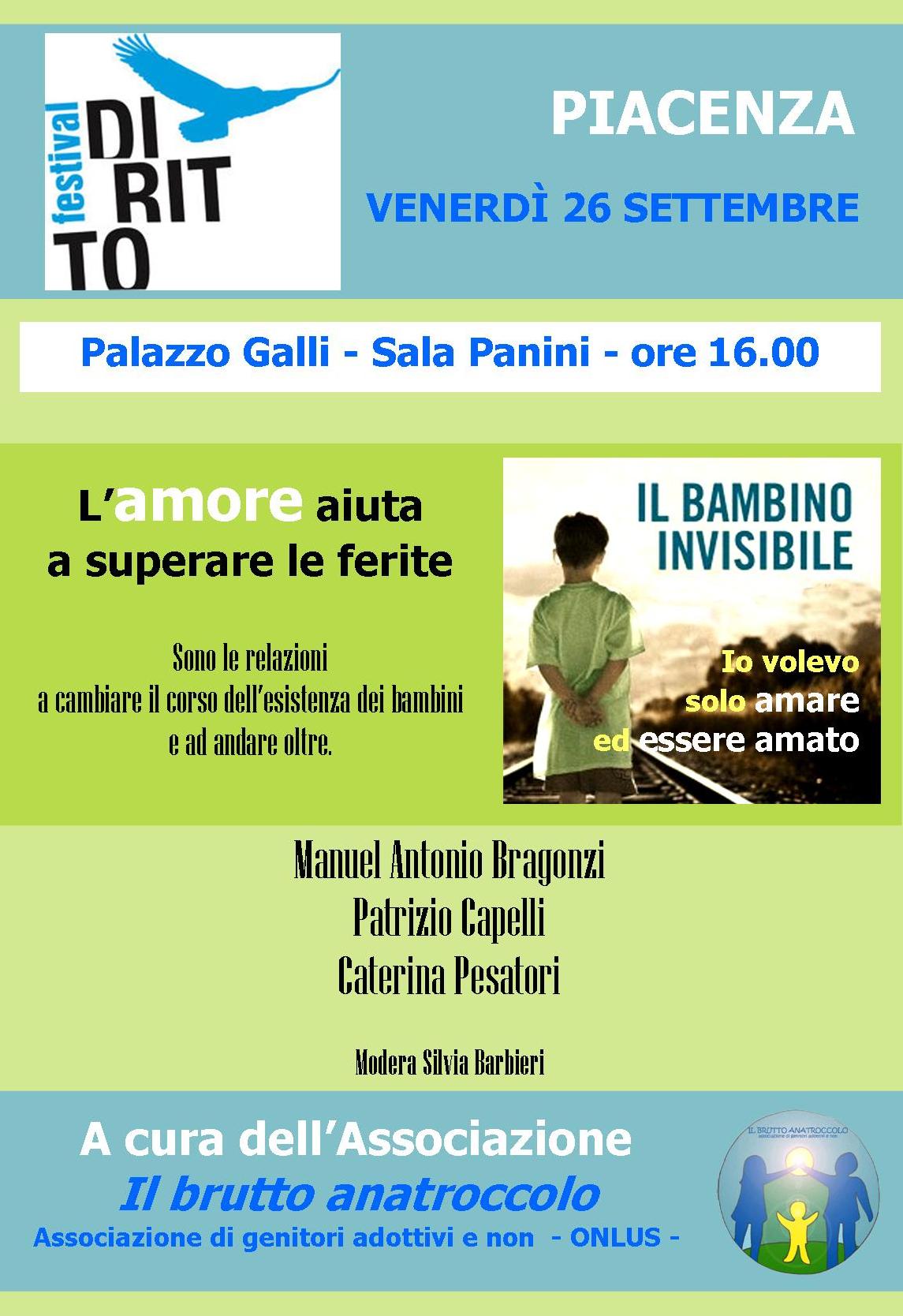 Il 26 settembre a Piacenza, nell’ambito del Festival del Diritto, l’Associaizone Il Brutto Anatroccolo organizza un evento dal titolo “Il Bambino invisibile, quando l’amore aiuta a superare le ferite”. Il Festival del Diritto di Piacenza quest’anno è dedicato al tema della Partecipazione ed Esclusione. L’incontro trae le sue sollecitazioni iniziali da un libro particolarmente suggestivo, Il bambino invisibile.Patrizio Capelli muove dalla storia di Manuel Bragonzi, un bambino di cinque anni che, per sfuggire all’esclusione e ai maltrattamenti del povero villaggio sudamericano in cui è nato, si rifugia a vivere nel bosco, in mezzo alla natura. E da lì nasce un percorso unico, solitario e doloroso, che subisce una svolta drastica solo attraverso un incontro. Ancora una volta, è la relazione a cambiare il corso di un’esistenza. Manuel riscopre la speranza nell’incontro con la famiglia dalla quale verrà poi adottato. Sarà poi lo stesso autore del libro, Manuel Bragonzi, a raccontare la sua esperienza di figlio. Caterina Pesatori, presidente dell’associazione Il brutto anatroccolo Onlus, illustrerà le attività e impegno del sodalizio nei confronti di genitori adottivi e non.